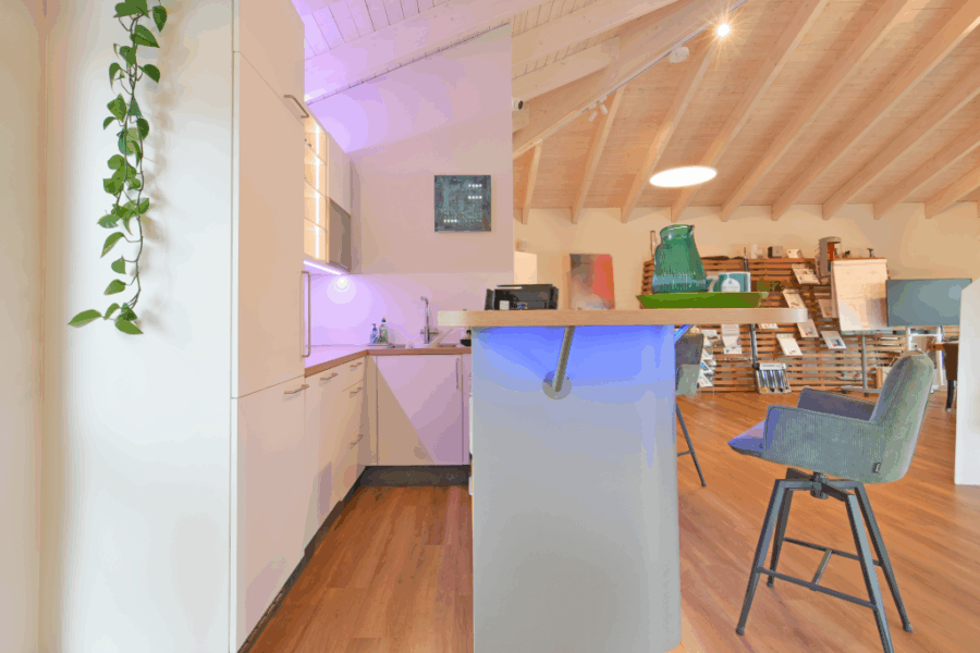 Die Gewerbefläche umfasst ca. 100 m² Gesamtnutzfläche, welche mit modernster Ausstattung versehen ist. Aktuell erstreckt sich die Fläche über ein Großraumbüro, eine Küche, zwei WCs sowie einen Lagerraum. Ein bereits installiertes Schienensystem im Boden bietet optimale Vorraussetzungen die Fläche in mehrere Räumlichkeiten zu teilen.