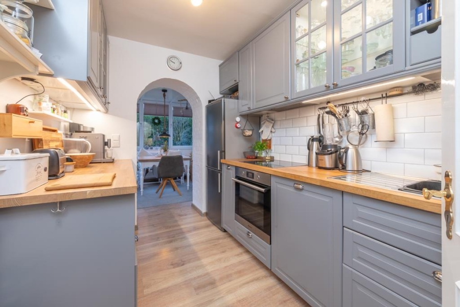 Linker Hand befindet sich die Einbauküche, welche mit einer modernen Einbauküche (graue Fronten und Holzarbeitsplatte) im Landhausstil sowie allen notwendigen elektrischen Geräten, wie einem Cerankochfeld, einem Backofen sowie einer Geschirrspülmaschine ausgestattet ist. Von hieraus gelangen Sie zudem in den gemütlichen Wintergarten, welcher ausreichend Platz für eine kleine Essecke bietet.