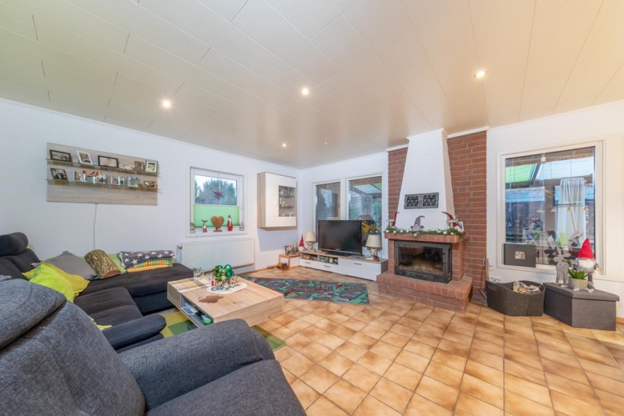 Der lichtdurchflutete Wohn- und Essbereich bildet das Herzstück der Immobilie. Hier lassen sich gemütliche Stunden im Kreis der Familie und Freunde verbringen. Ein Kamin sorgt zudem für eine gemütliche Atmosphäre und wohlige Temperaturen. Der angrenzende Wintergarten bietet zusätzlichen Platz zur individuellen Gestaltung.