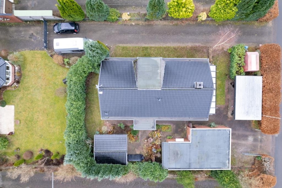 Von außen präsentiert sich die Immobilie in einem roten Klinker, welcher ab Höhe des Dachgeschosses von anthrazitfarbenen Schindeln bedeckt ist. Passend hierzu ist das Haus mit dunklen Dachpfannen gedeckt.