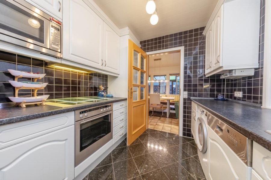 Die Küche überzeugt mit einer zeitlosen Einbauküche. Sie ist ausgestattet mit einem Backofen samt Cerankochfeld, einer Geschirrspülmaschine sowie einer Mikrowelle. Zudem befindet sich hier der Waschmaschinenanschluss.