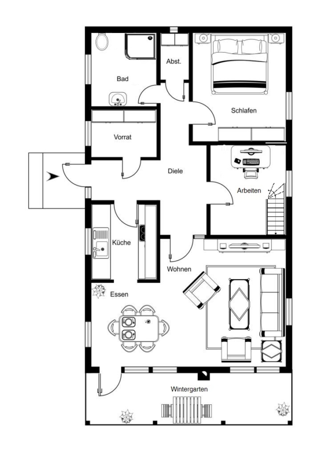 Abgerundet wird das Raumangebot durch eine praktische Abstellkammer, die Platz für Reinigungsutensilien und Alltägliches bietet. Gegenüber der Küche befindet sich zusätzlich eine praktische Vorratskammer, welche ebenfalls mit Einbauschränken versehen ist.