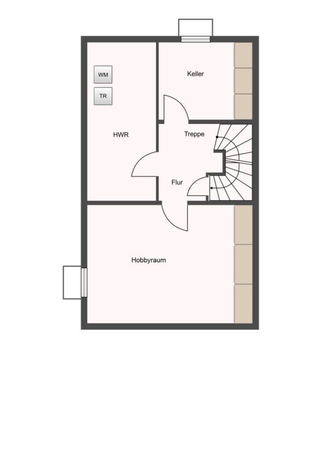 Der Weg in den Keller führt über eine massive und geflieste Treppe. Dieser beherbergt einen wohnlich gestalteten Flurbereich, einen Heizungsraum mit Waschmaschinenanschluss, ein Abstellraum sowie einen großzügigen Hobbyraum.
