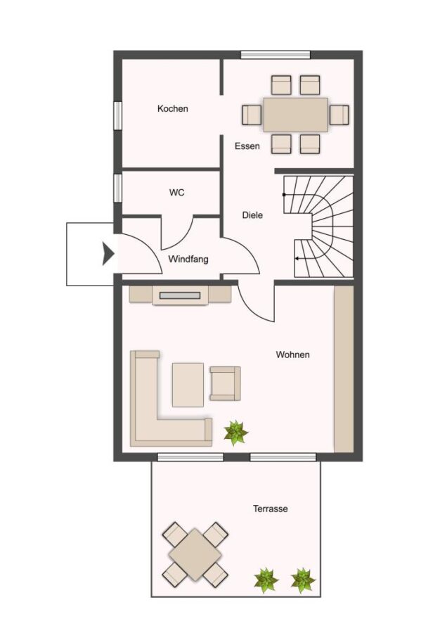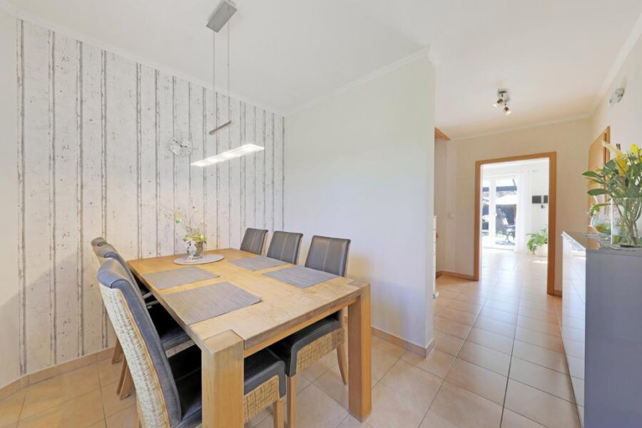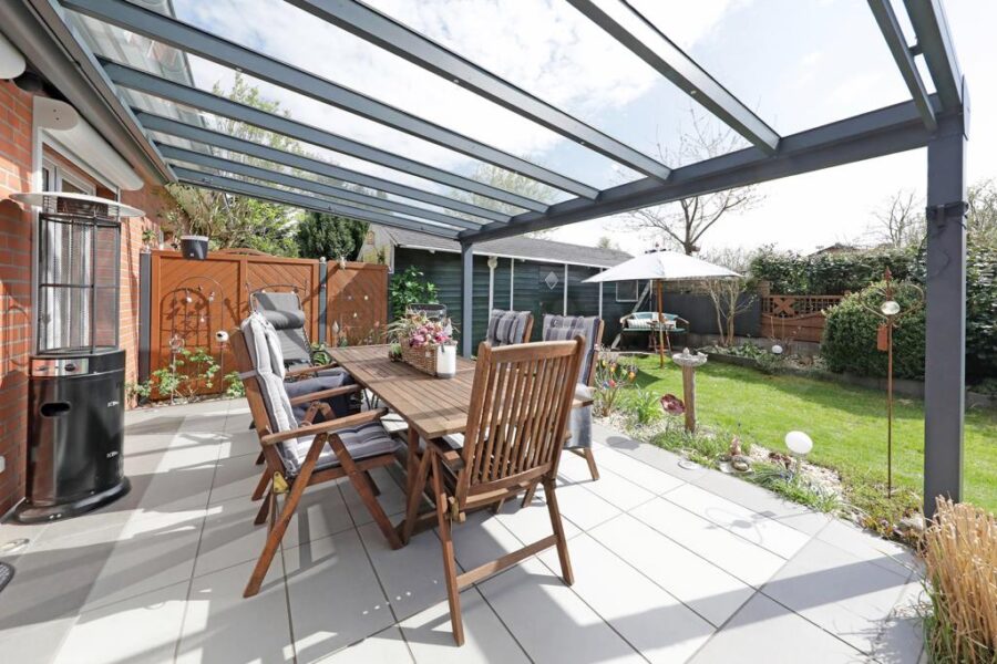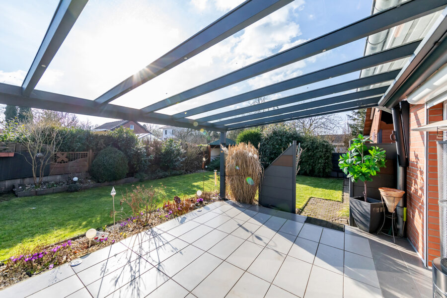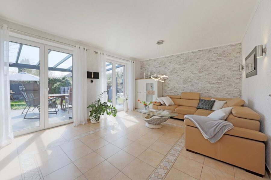 Das lichterfüllte und offen gestaltete Wohnzimmer ist hell gefliest und bildet gleichzeitig das Herzstück des Hauses. Hier ist ausreichend Platz für eine gemütliche Sofalandschaft für die ganze Familie. Die Steckdosen im Wohnzimmer sind mit USB-Anschlüssen versehen. Vom Wohnzimmer aus erhalten Sie über die große Fensterfront einen herrlichen Blick und einen praktischen Zugang auf die überdachte Terrasse und den Garten. Die nachträgliche Überdachung der Terrasse erfolgte im Jahre 2018.