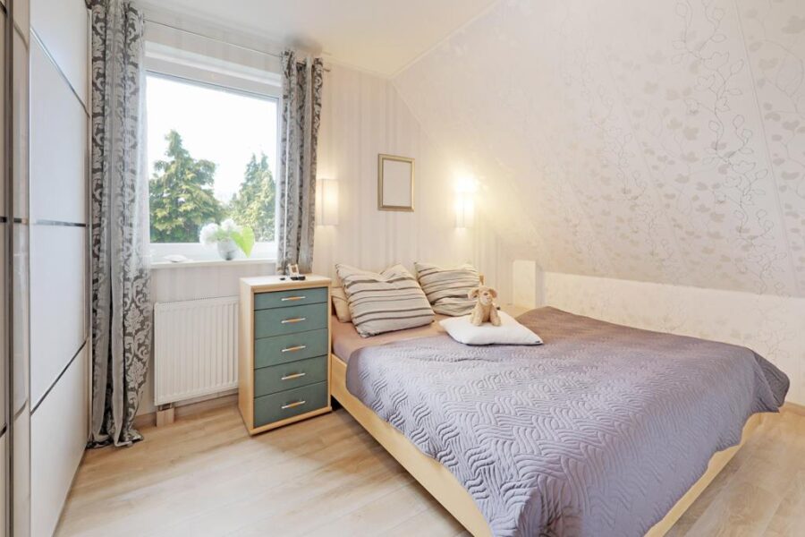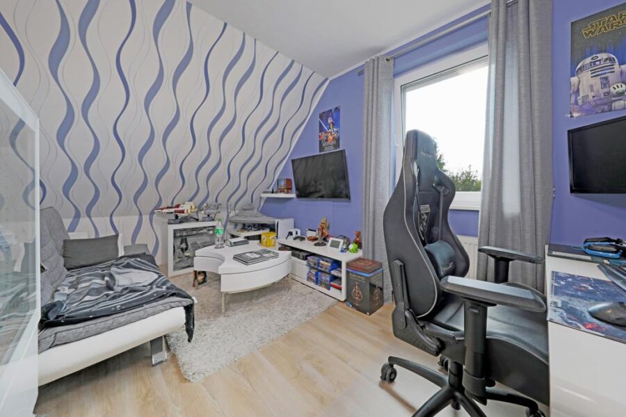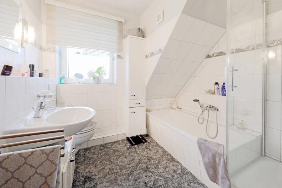 Über die Treppe gelangen Sie in das Obergeschoss, in dem ein pflegeleichter Laminatfußboden verlegt ist. Hier befinden sich drei weitere Zimmer, die sich optimal als Elternschlafzimmer, Kinder- oder Gästezimmer nutzen lassen. Abgerundet wird das Raumangebot durch das Vollbad mit separater Dusche, das mit hellen Sanitärobjekten gestaltet ist und mit einem großen Fenster punktet. Eine Fußbodenerwärmung sorgt hier für eine behagliche Wärme.