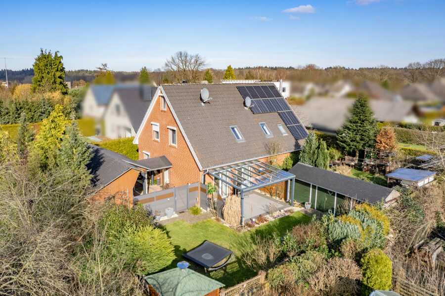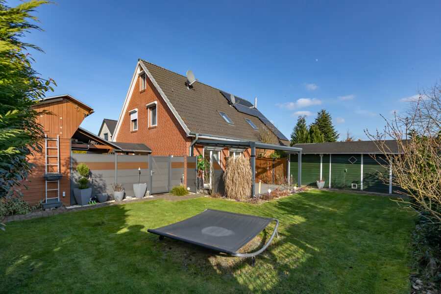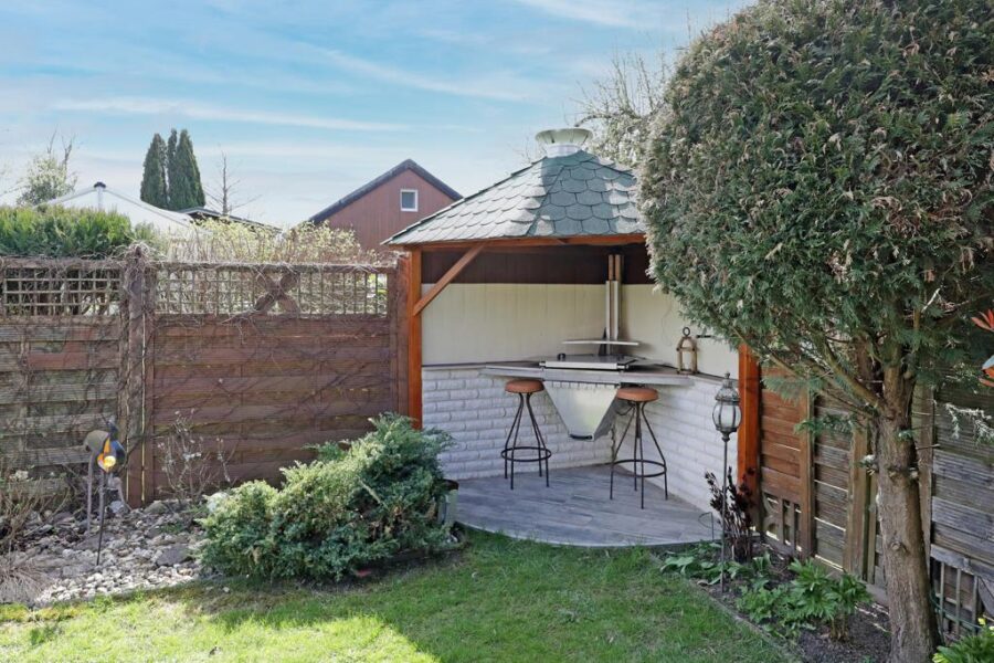 Das ca. 459 m² große Grundstück ist mit Liebe zum Detail angelegt und bietet vielfältige Nutzungsmöglichkeiten und ein Höchstmaß an Privatsphäre. Eine sonnenverwöhnte Südterrasse mit Überdachung und eine schöne Grillecke laden zu entspannten Stunden im Freien ein. Ein Gartenhaus bietet ausreichend Stellfläche für Gartengeräte und Co.