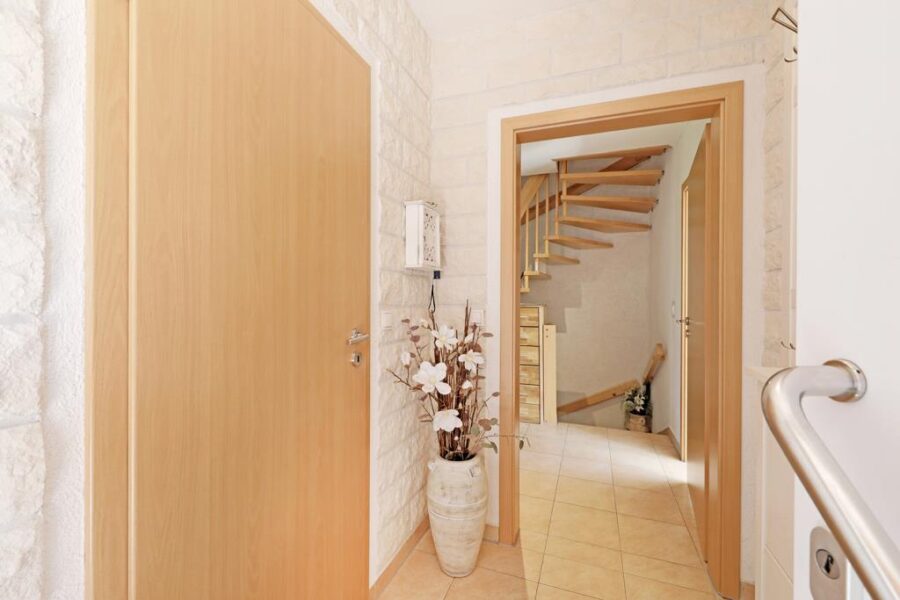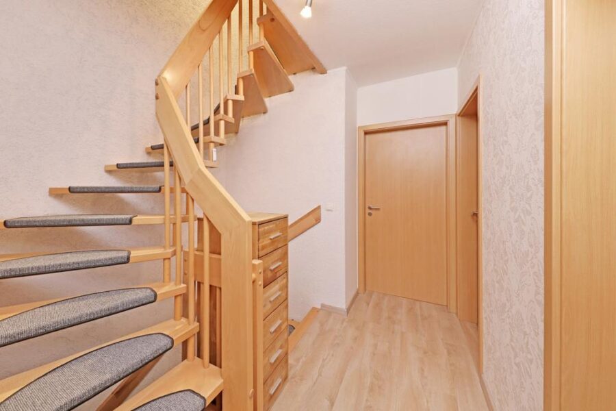 Von der Diele aus gelangen Sie über eine offene Holztreppe mit einer raffinierten LED-Beleuchtung in die oberen Ebenen des Hauses.