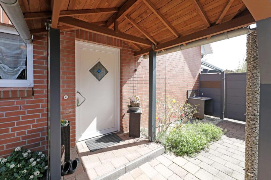 Vorbei an dem Carport führt der Weg über einen überdachten Hauseingang in den freundlich gestalteten Eingangsbereich des Hauses.