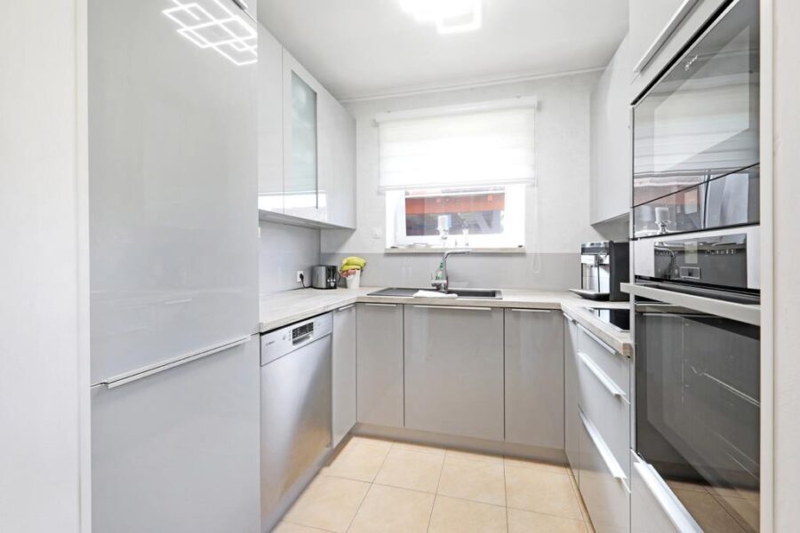 Die Küche kann mit einer neuen Einbauküche mit grauen Einbauschränken und einer hellen Holzarbeitsplatte punkten. Die vorhandene Ausstattung lässt keine Wünsche offen und bietet alles, was Hobbyköche brauchen. Dazu zählt eine Mikrowelle, ein Ofen, ein Induktionskochfeld mit Abluft nach draußen, ein Geschirrspüler der Marke Bosch und eine Kühl-/Gefrierkombination von Neff. Die angrenzende und offene Essdiele bietet Platz für einen großen Esstisch und lädt zu geselligen Stunden mit den Freunden ein.