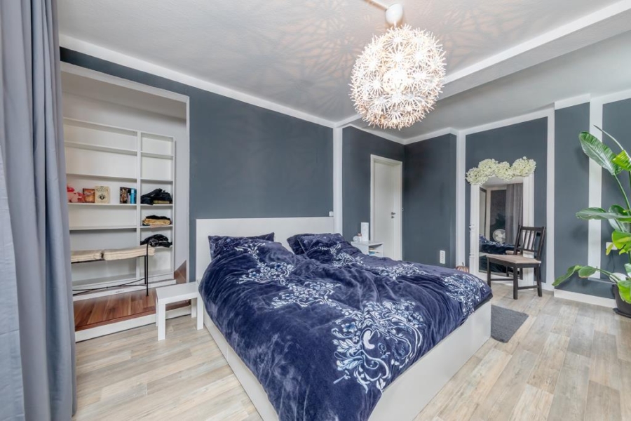 Über die massive Treppe im Obergeschoss angelangt, erreichen Sie rechter Hand das Elternschlafzimmer, in welchem sich problemlos ein großzügiges Doppelbett unterbringen lässt. Ein separierter Bereich dient praktischerweise als begehbarer Kleiderschrank.