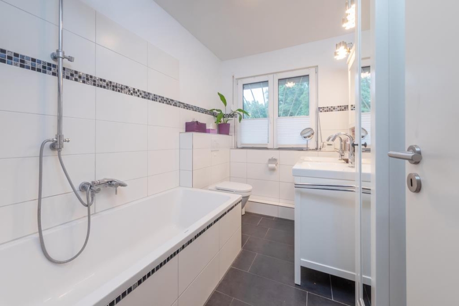 Angrenzend befindet sich das identisch zum Bad im Erdgeschoss geflieste Vollbad, welches mit einem Fenster für optimale Belüftung überzeugt.