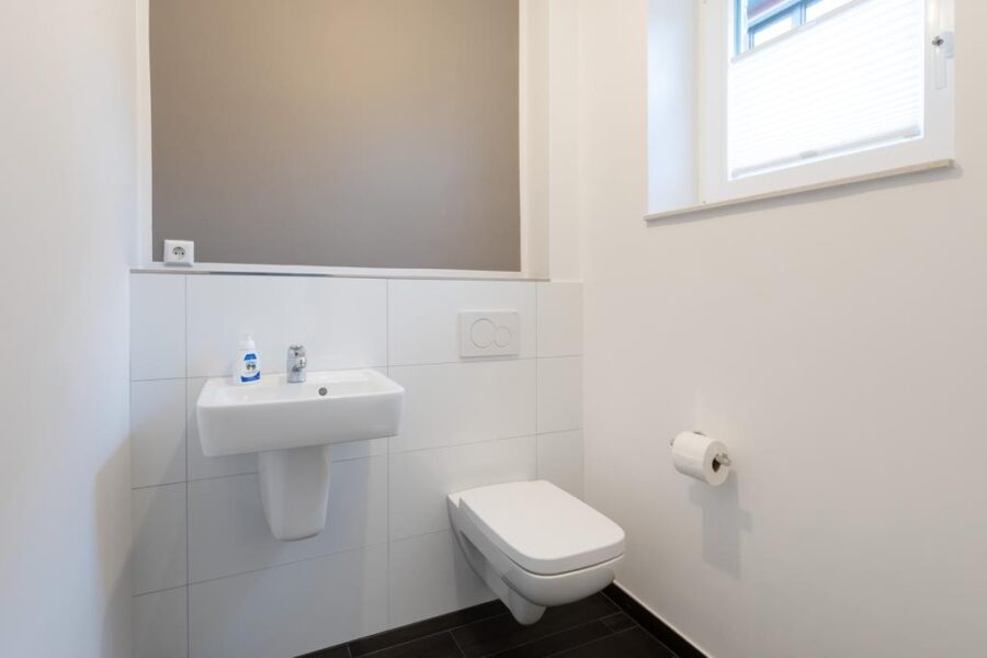 Rechter Hand ist ein hell gefliestes Gäste-WC mit Fenster untergebracht.