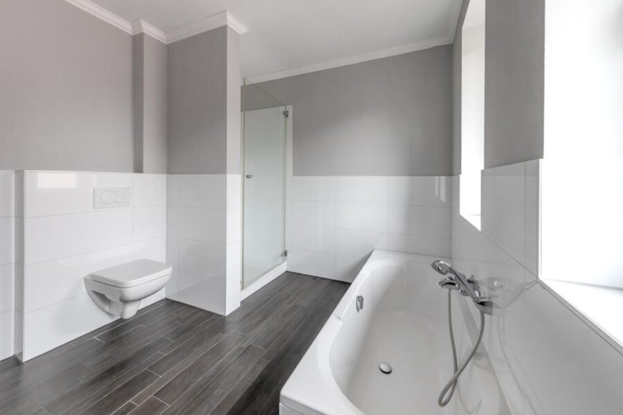 Das Vollbad mit seperater Dusche ist großzügig aufgeteilt und der dunkle Fußboden bietet einen sehr schönen, modernen Kontrast zu den weißen Sanitärobjekten.
