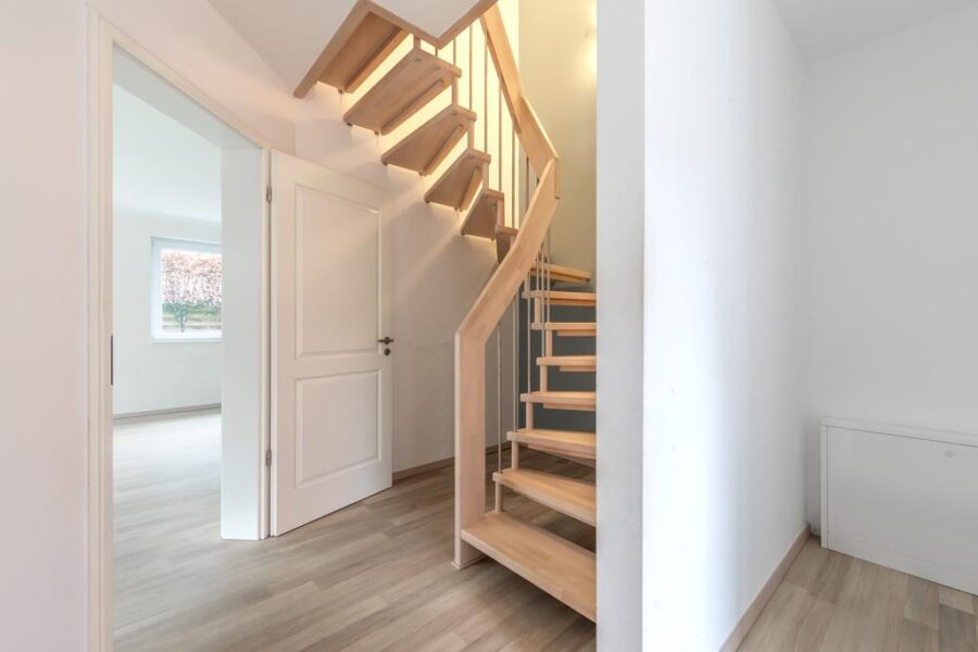 Über eine offene Holztreppe führt der Weg ins Obergeschoss, welches drei Zimmer sowie ein Badezimmer beherbergt.