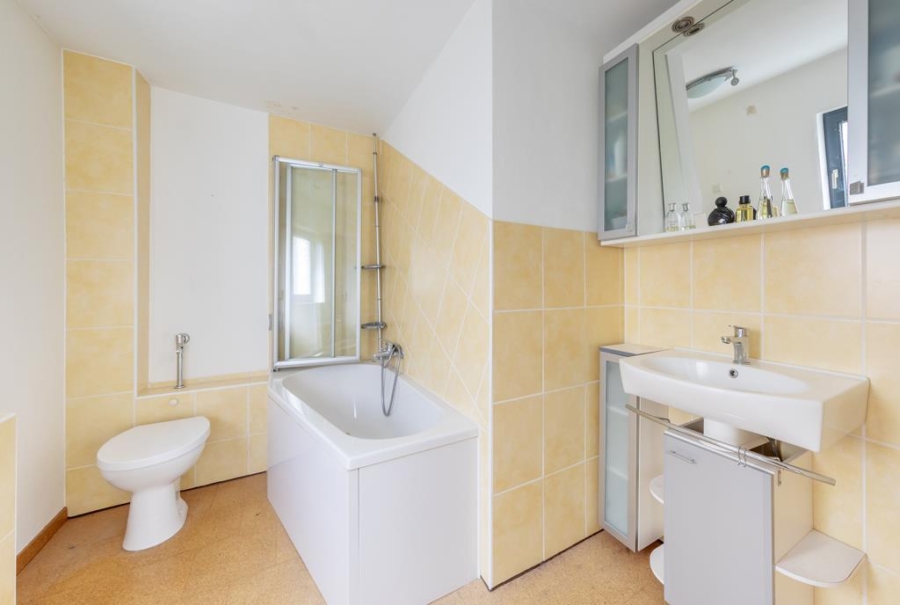 Angrenzend befindet sich das hell geflieste Tageslichtbad mit Badewanne und dem Potenzial eine persönliche Wohlfühloase zu schaffen.