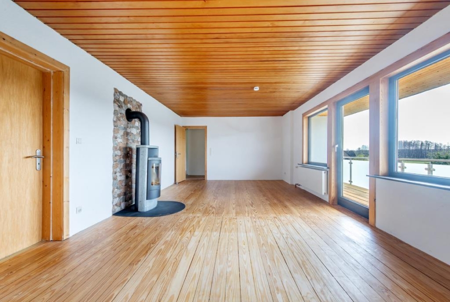 Der großzügige Wohnbereich bildet das Herzstück des Hauses – große Fensterflächen schaffen eine freundliche, helle Wohnatmosphäre. Von hier aus gelangen Sie direkt auf die Loggia, welche zu entspannten Stunden in der Sonne einlädt. Ein Kaminofen sorgt zusätzlich für wohlige Wärme und macht den Wohnbereich gerade in der kühleren Jahreszeit zu einem echten Lieblingsplatz.