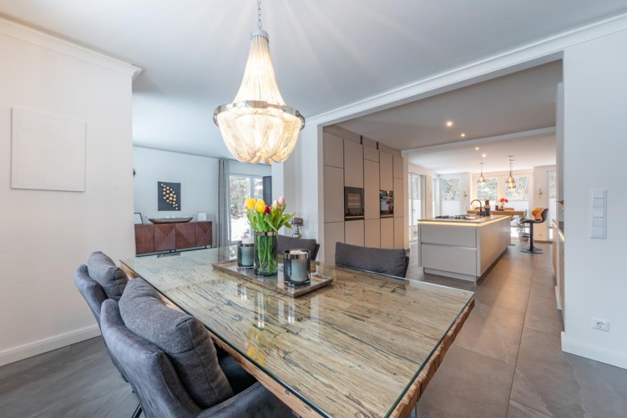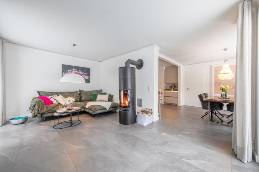 Linker Hand des Flurs gelangen Sie in den Wohnbereich, der ausreichend Platz für eine Sofalandschaft sowie eine weitere Essgelegenheit für Gäste bietet.
