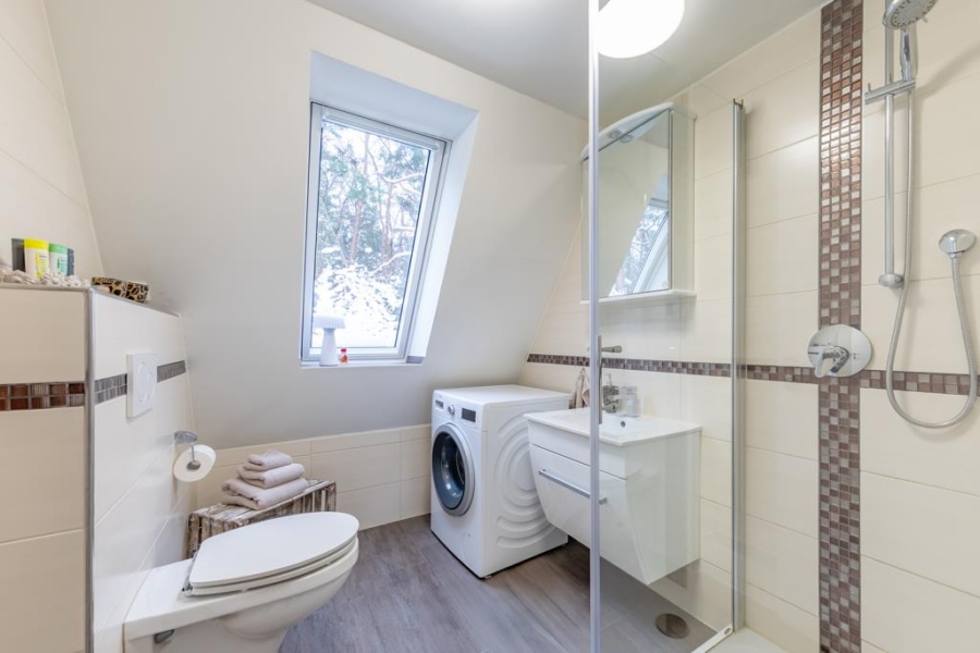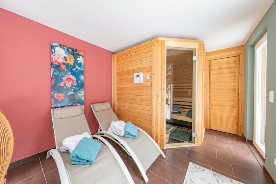 Ein modernisiertes Gäste-WC sowie Duschbad mit Zugang zum Garten lassen keinerlei Wünsche offen. Doch das ist noch nicht alles: Durch den Garten gelangen Sie zu einem Highlight des Hauses – dem Saunabereich.