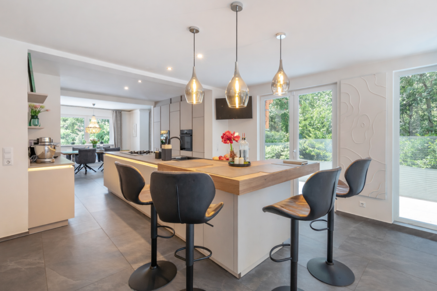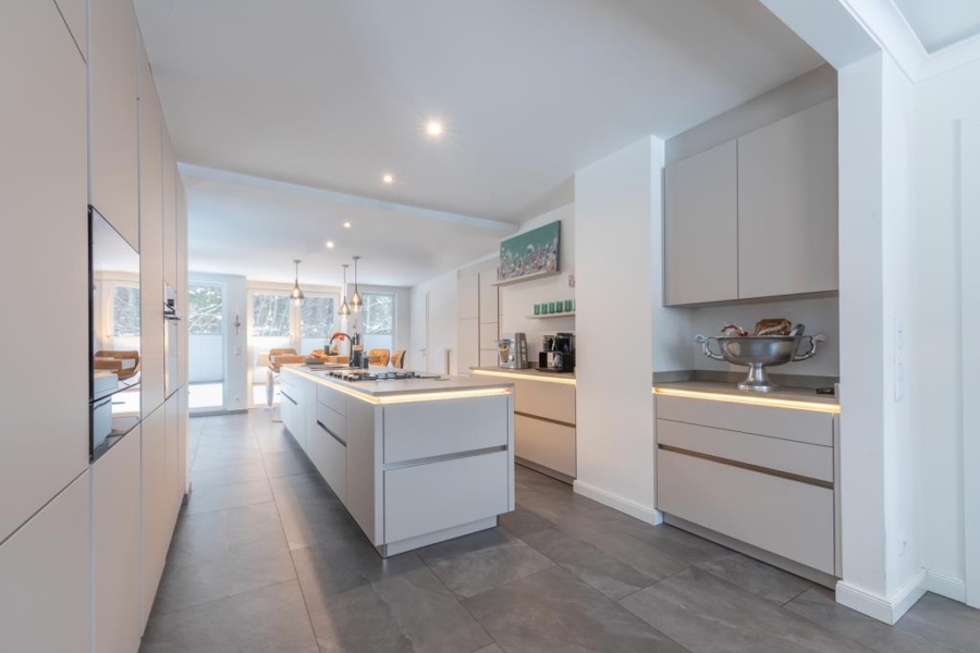 Angrenzend an den Wohnbereich befindet sich die luxuriöse Einbauküche mit der wahrscheinlich längsten Kochinsel Escheburgs. Sämtlichen Elektrogeräte wie unter anderem ein Herd, Backofen, ausfahrbarer Dunstabzug, Geschirrspüler, Weinkühler und Kühlschrank sowie ausreichend Stauraum in Form von Schränken sind vorhanden. Ein separater Gasherd mit eigener Gasversorgung ergänzt die Küchenausstattung.