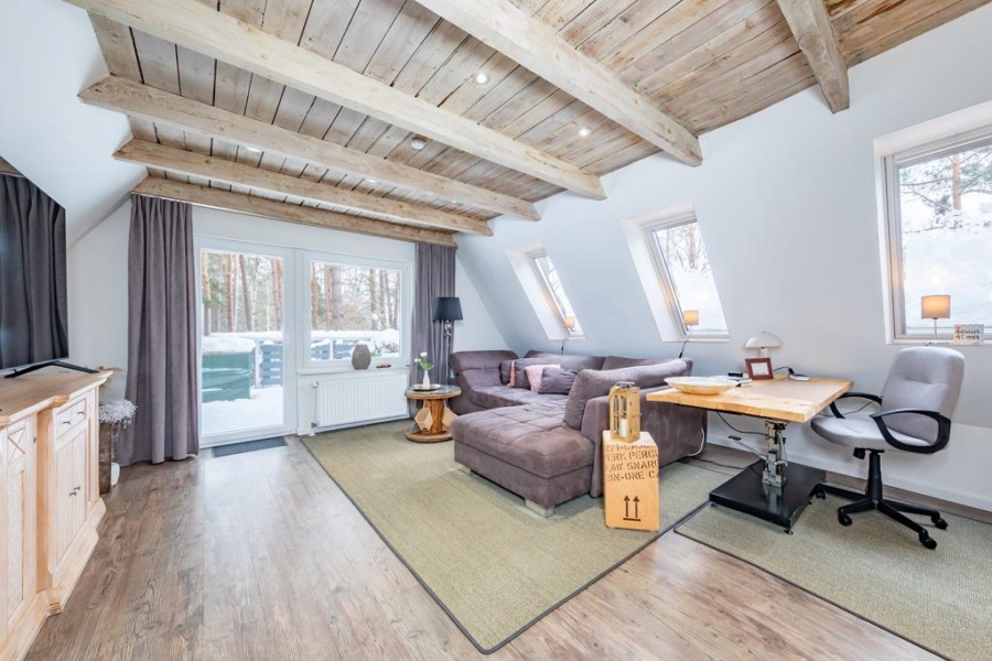 Rechter Hand befindet sich eine moderne Einbauküche inklusive Essbereich mit charmantem Holztragwerk. Nach einem leckeren Essen können Sie sich im angrenzenden Schlafzimmer zur Ruhe legen.