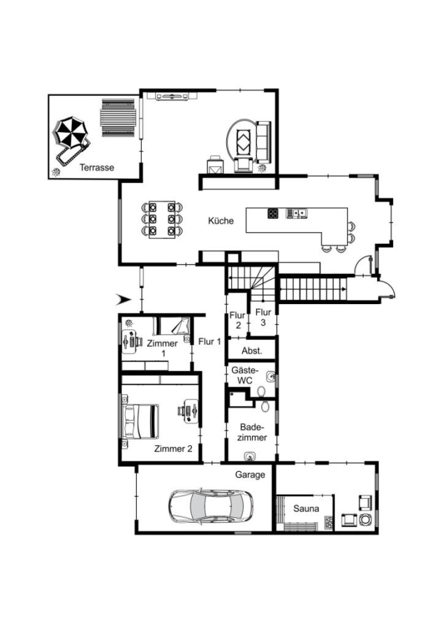 Zurück im Flur gelangen Sie zu den weiteren Räumlichkeiten des Hauses. Dazu zählen unter anderem ein gemütliches Schlafzimmer und ein Büro sowie die wohnlich ausgebaute Garage. Diese bietet Ihnen entweder den perfekten Rückzugsort, oder eröffnet die Möglichkeit, den Raum als exklusiven Showroom, beispielsweise für eine Harley-Davidson, zu inszenieren.