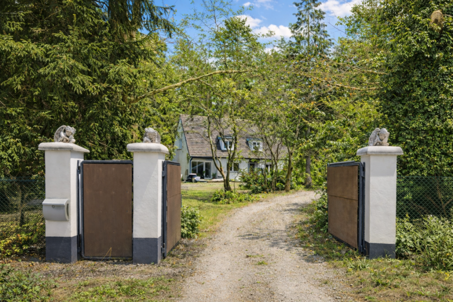 Das ca. 4.976 m² große Grundstück zeichnet sich durch eine ruhige Lage und viel Potenzial aus. Umgeben von einer grünen, naturnahen Umgebung, bietet es eine großzügige Fläche mit alten, gut gepflegten Bäumen, darunter imposante Eichen und Kiefern, die angenehmen Schatten spenden und für natürlichen Windschutz sorgen.