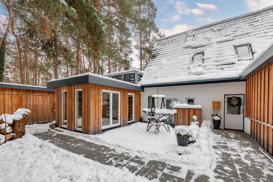 Zum Außenbereich gehören ein Doppelcarport, ein Gartenhaus sowie eine Gartensauna inklusive Kältebecken mit kurzen Wegen. Ein Whirpool würden diesen Bereich ideal ergänzen und fände ebenfalls seinen Platz.