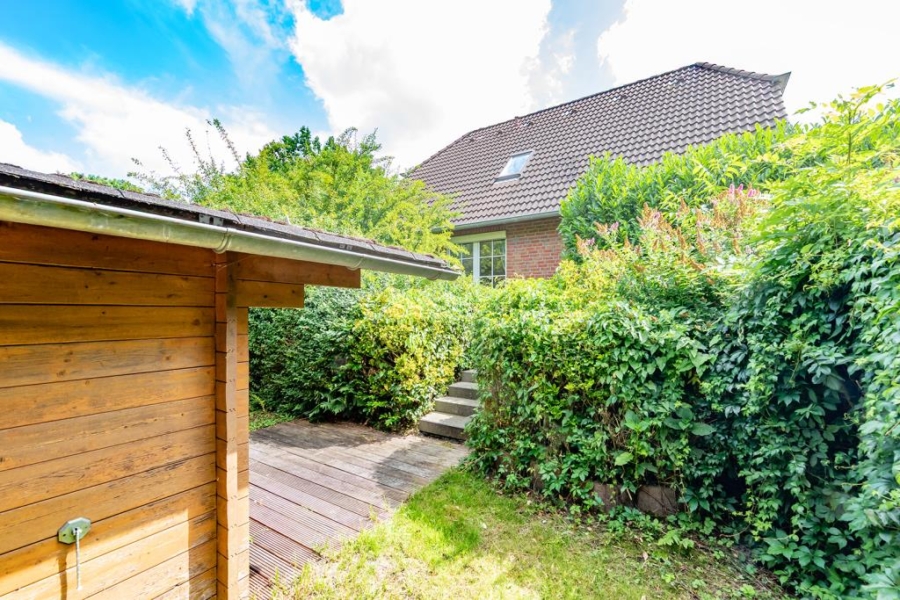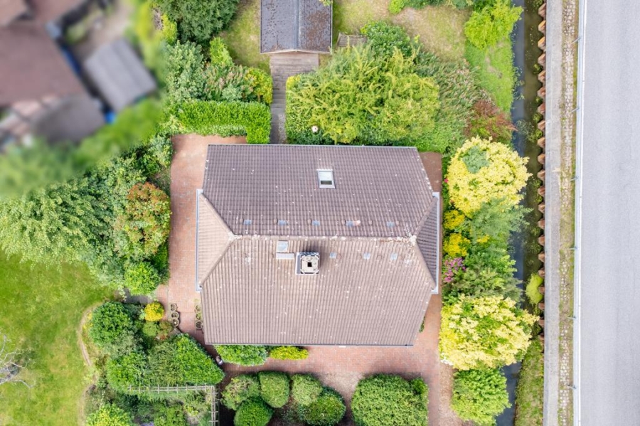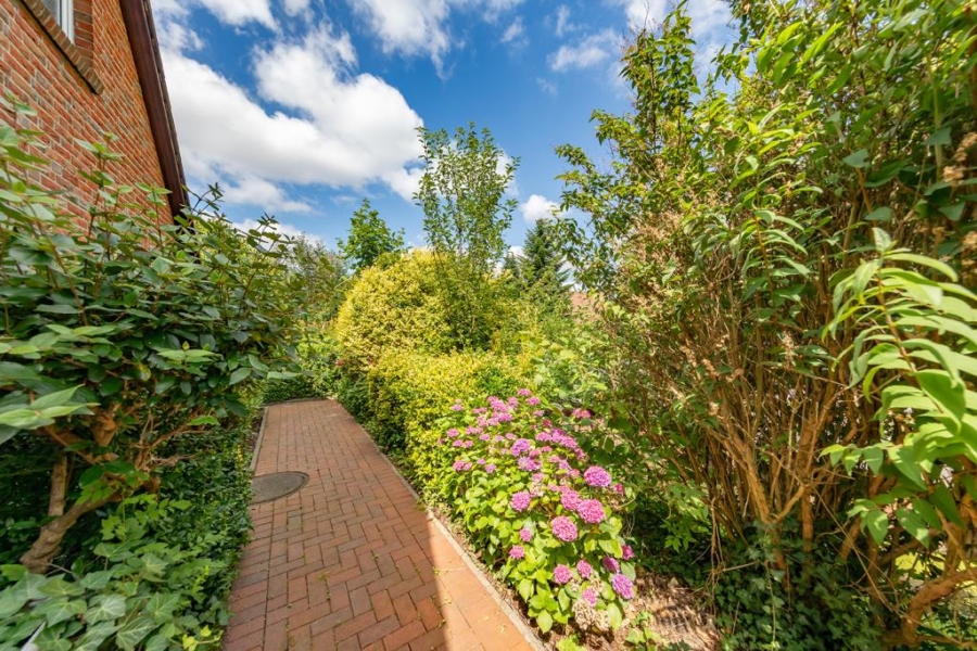 Von außen präsentiert sich die Immobilie in einem klassisch norddeutschen Rotklinker, weißen, doppelt isolierverglasten Kunststofffenstern und einem mit rotbraunen Dachpfannen eingedeckten Krüppelwalmdach.