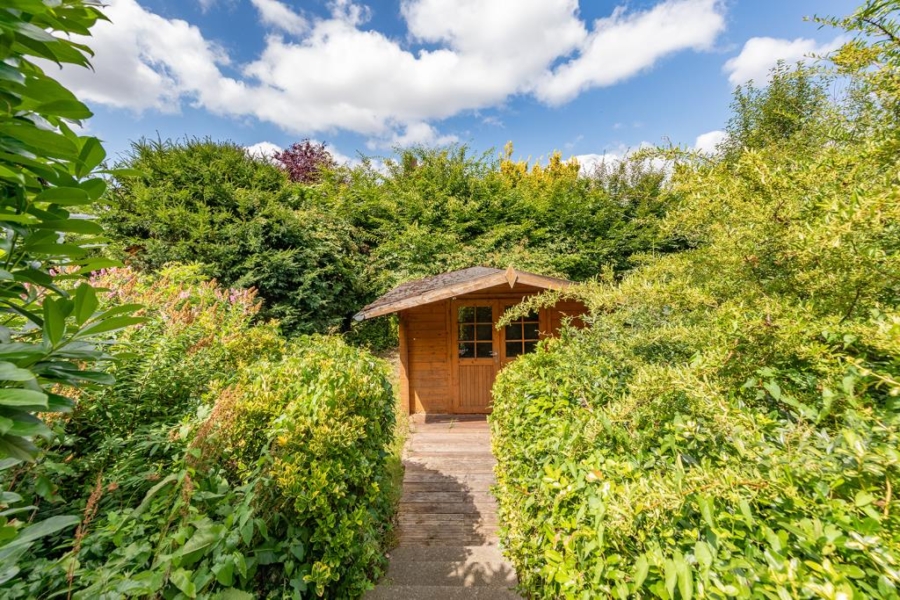 Ein charmanter Holzschuppen bietet ausreichend Platz zur Unterbringung von Gartengeräten und Co.