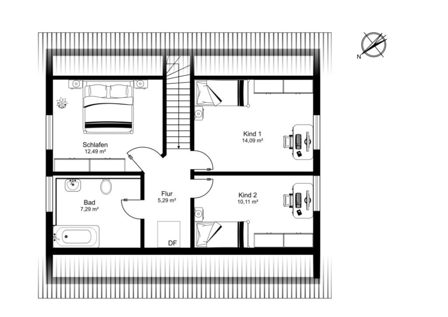 Über eine Holztreppe erreichen Sie das Dachgeschoss, welches drei Zimmer sowie das Badezimmer für Sie bereithält.