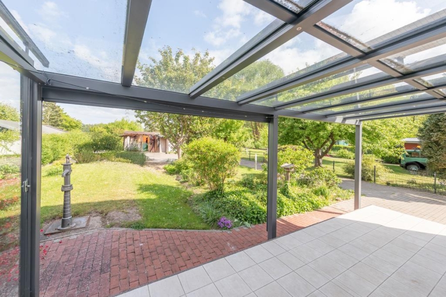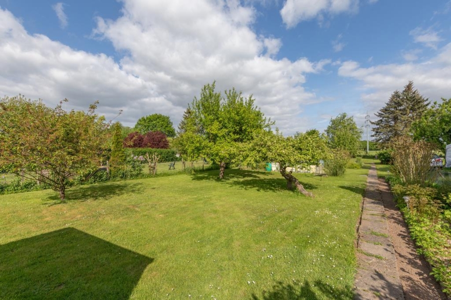 Das Grundstück eröffnet sich Ihnen nach hinten mit einer großen Rasenfläche, welche mit zwei Schuppen und einem Gewächshaus bebaut ist. Die weitläufigen Grünflächen mit ihren sonnigen Bereichen laden zum Entspannen und Verweilen ein. Mehrere Obstbäume sowie der freie Blick in das angrenzende Wasserschutzgebiet unterstreichen die naturnahe Lage und sorgen für ein Gefühl wie im Urlaub – direkt im eigenen Garten.