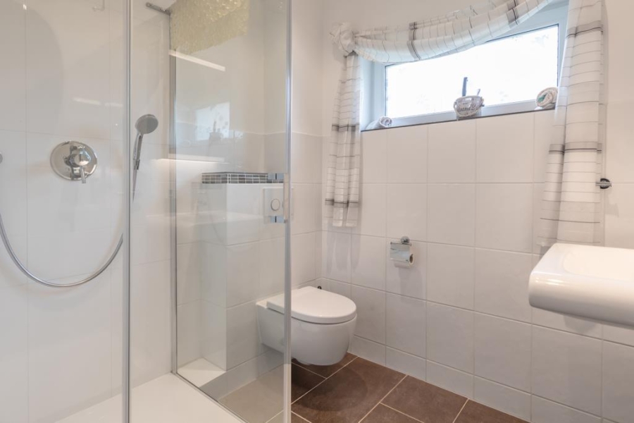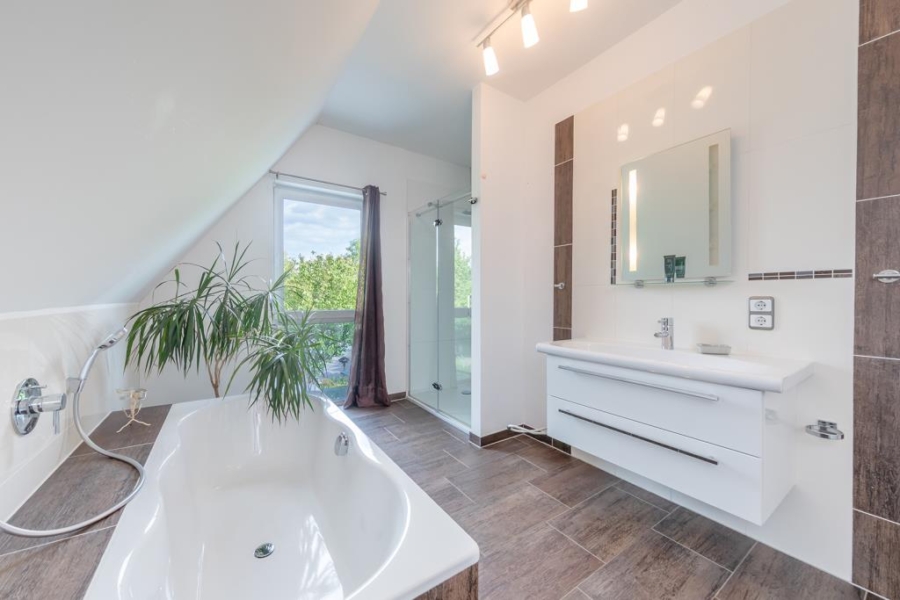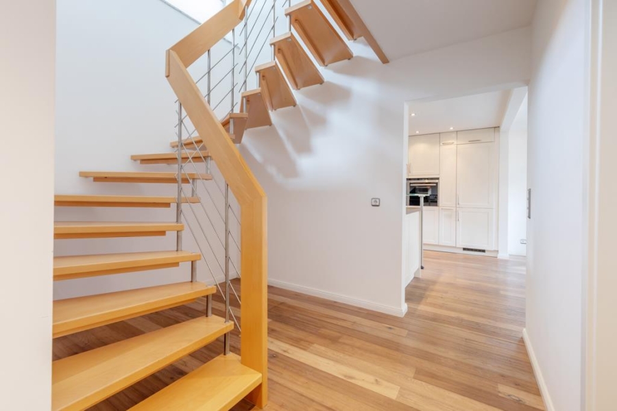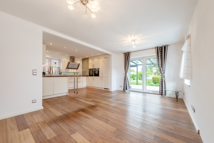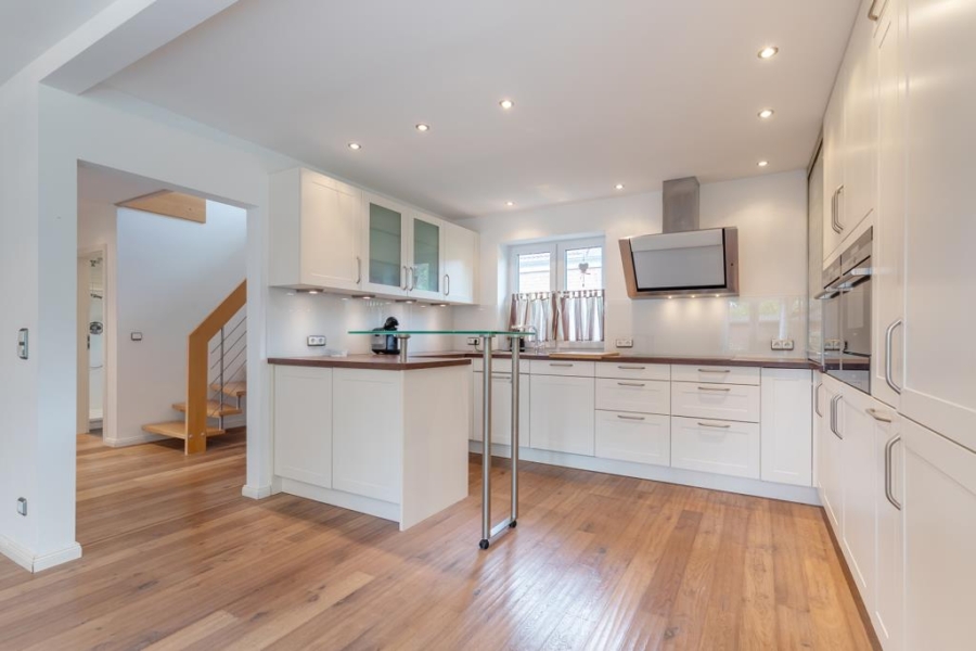Das umfassend umgebaute Einfamilienhaus befindet sich im hinteren Bereich des Grundstücks. Auf ca. 137 m² Wohn- und Nutzfläche überzeugt diese Immobilie mit einer gehobenen Ausstattung – unter anderem einer hochwertigen Einbauküche mit Geräten namhafter Hersteller. Eine überdachte Terrasse mit integriertem Sonnenschutz bietet einen gemütlichen Ort für Stunden mit Freunden und der Familie.