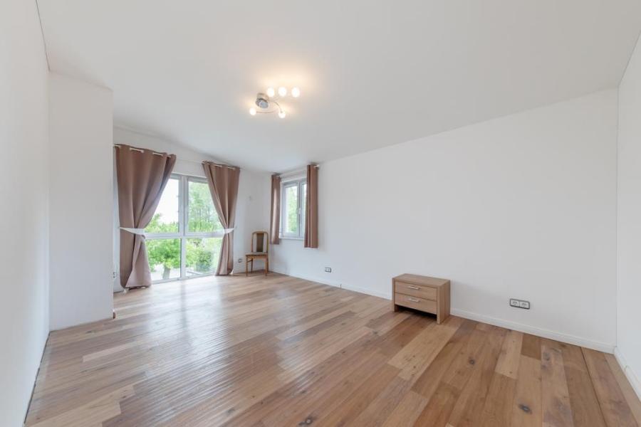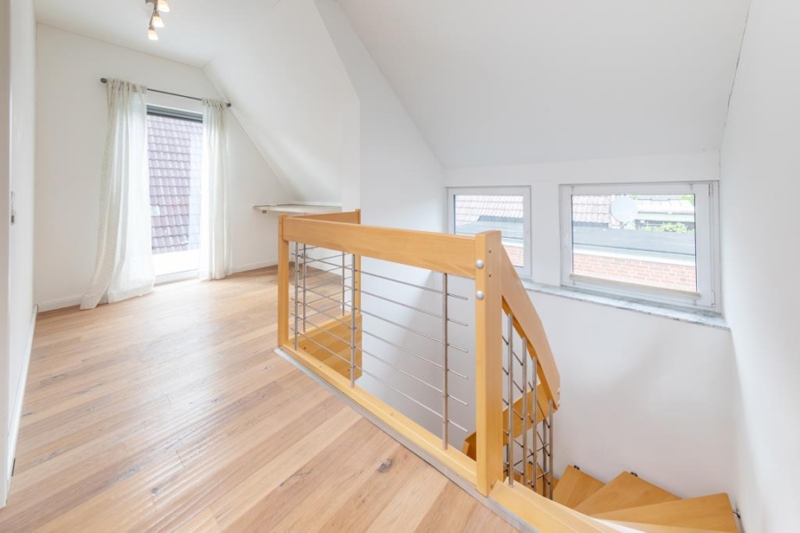 Der stilistisch moderne Wohntraum hält einen großzügig und offen gestalteten Wohn- und Kochbereich, insgesamt drei gut geschnittene Schlaf-, Kinder- oder Arbeitszimmer, ein Dusch- sowie ein Vollbad und einen Hauswirtschaftsraum für Sie bereit. Der Flur im Obergeschoss verfügt über sämtliche Anschlüsse für eine Küchenzeile, was bei Bedarf das separierte Wohnen auf zwei Ebenen ermöglicht. Von hier haben Sie zudem die Möglichkeit das Flachdach auf dem Hauswirschaftsraum zu betreten, welche sich ideal zur traumhaften Dachterrasse umfunktionieren lässt. Sämtliche Wohnräume dieses Einfamilienhauses sind mit Echtholzboden ausgestattet.