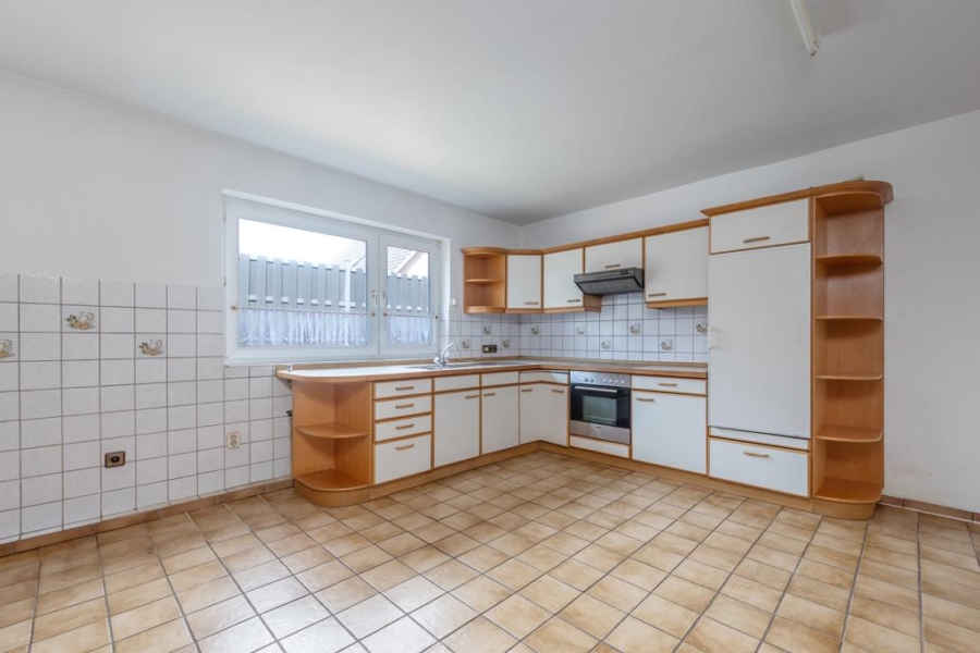Die geräumige Küche bietet neben der vorhandenen Einbauküche ausreichend Platz für einen Esstisch. Eine Speisekammer dient zum Verstauen von Vorräten und Co.