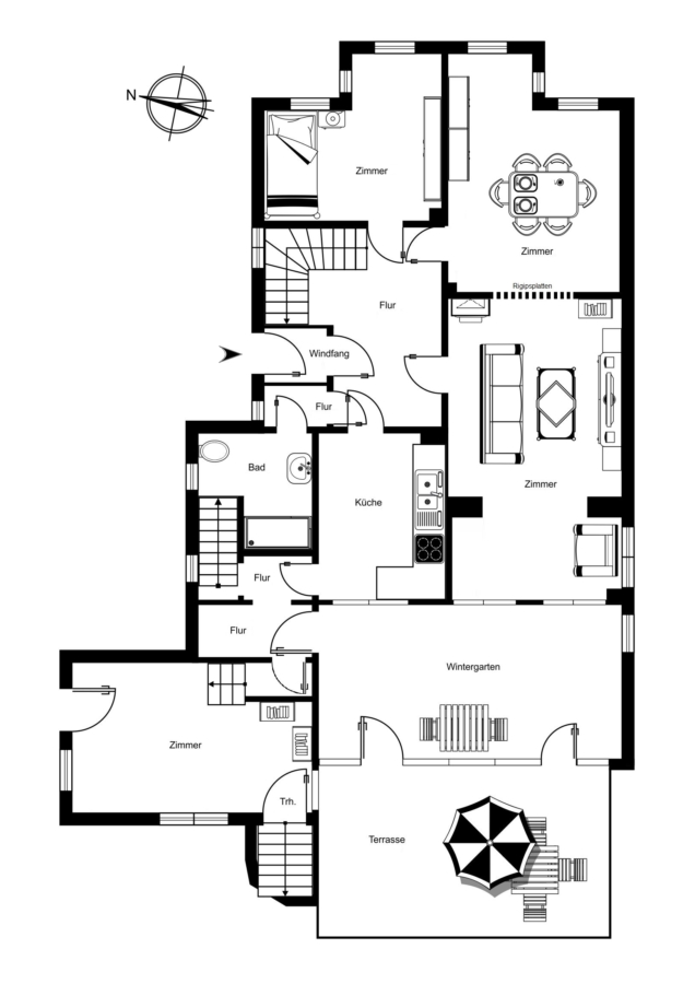 Der weitläufige Gartenbereich schafft reizvolle Aufenthaltsorte im Freien. Besonders der Bereich am Wintergarten lädt zu geselligen Stunden im Sommer ein, während der geschützte Garten hinter dem Haus Ruhe und Erholung verspricht.
