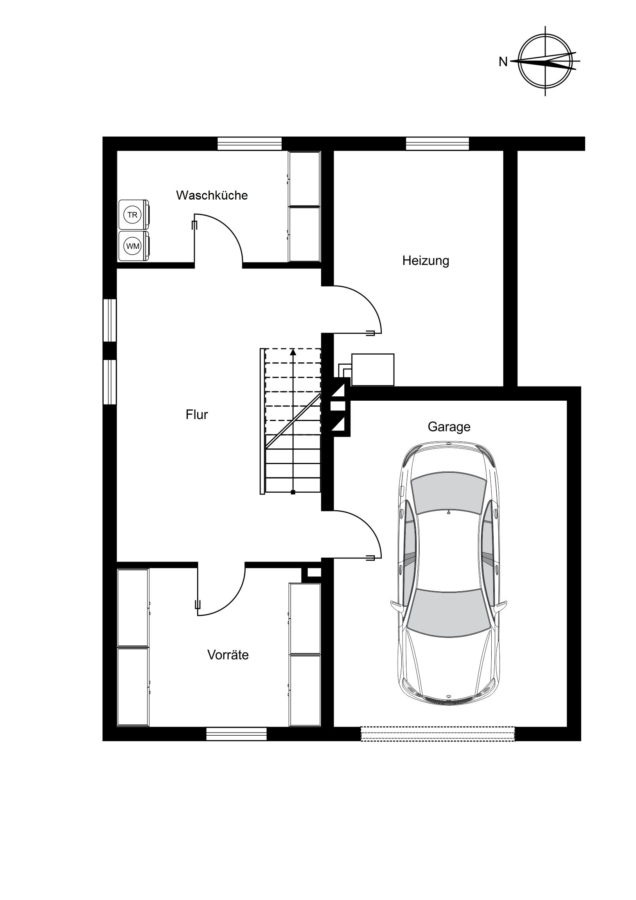 Im Kellergeschoss steht neben dem Heizungsraum und einem Vorratsraum auch eine Waschküche mit zusätzlicher Abstellfläche zur Verfügung. Besonders praktisch: Die Garage ist direkt in das Kellergeschoss integriert und bietet einen direkten Zugang ins Haus – ideal, um die Einkäufe auch an Regentagen trocken ins Haus zu befördern.