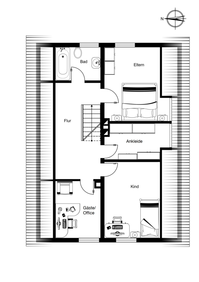 Im Dachgeschoss befinden sich ein geräumiges Elternschlafzimmer, ein Kinderzimmer, ein weiteres Gäste- oder Arbeitszimmer sowie ein Tageslichtbad mit Badewanne. Ein zusätzlicher Raum bietet sich ideal als Ankleidezimmer an.