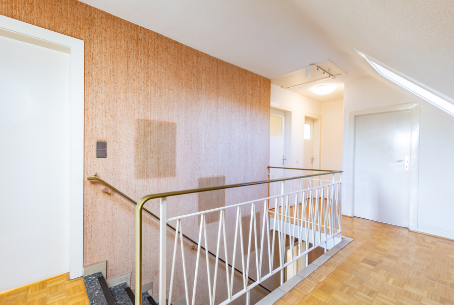Sämtliche Wohnräume beider Ebenen sind mit Ausnahme eines Zimmers im Dachgeschoss mit Stäbchenparkett versehen. Vollbad, Gäste-WC, Küche sowie Flur sind selbstverständlich gefliest.