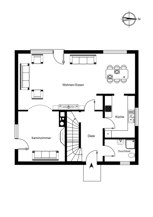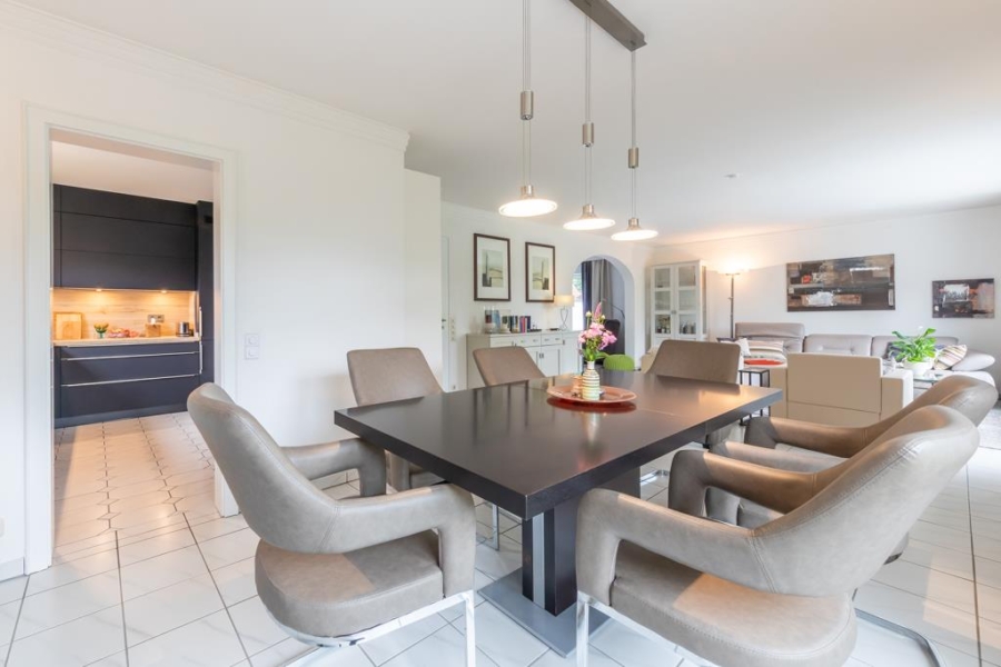Das Herzstück des Hauses bildet der offene Wohn- und Essbereich, welcher durch große Fensterflächen lichtdurchflutet ist und direkten Zugang zu beiden Terrassen bietet. Die angrenzende Küche ist separiert und dennoch nah zum Essbereich, ideal für den Familienalltag oder gesellige Abende.