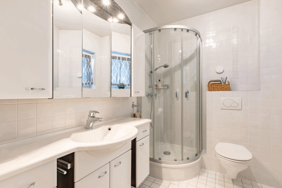 Im Eingangsbereich befinden sich die Diele sowie ein zeitloses Duschbad.