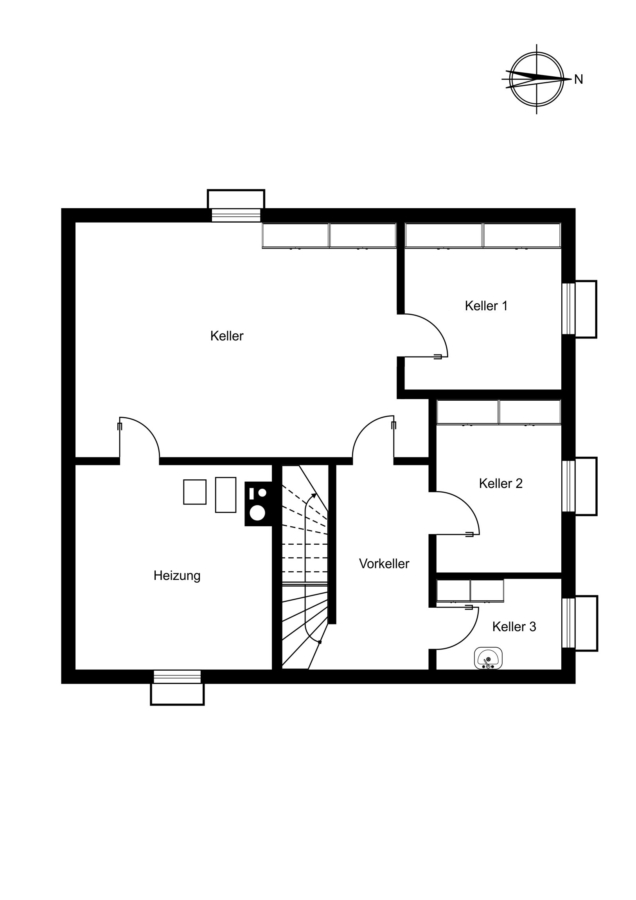 Der Kellerbereich bietet viel Platz für ein Hobby, die Vorräte und Haushaltsgeräte. Neben einem großen Kellerraum befinden sich hier vier weitere Kellerräume, darunter ein Hauswirtschaftsraum mit Waschmaschinenanschluss sowie der Heizungsraum.