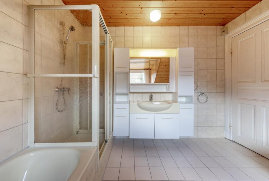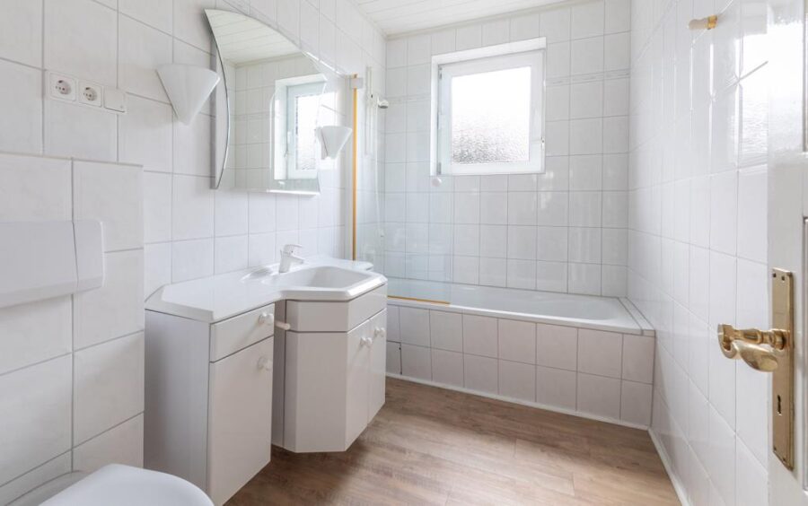 Geradeaus führt der Weg in ein Vollbad mit hellen Sanitärobjekten und einem Fenster, welches für ausreichend Licht und eine gute Belüftung sorgt.
