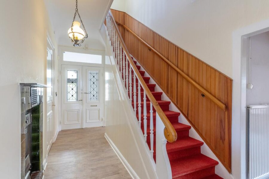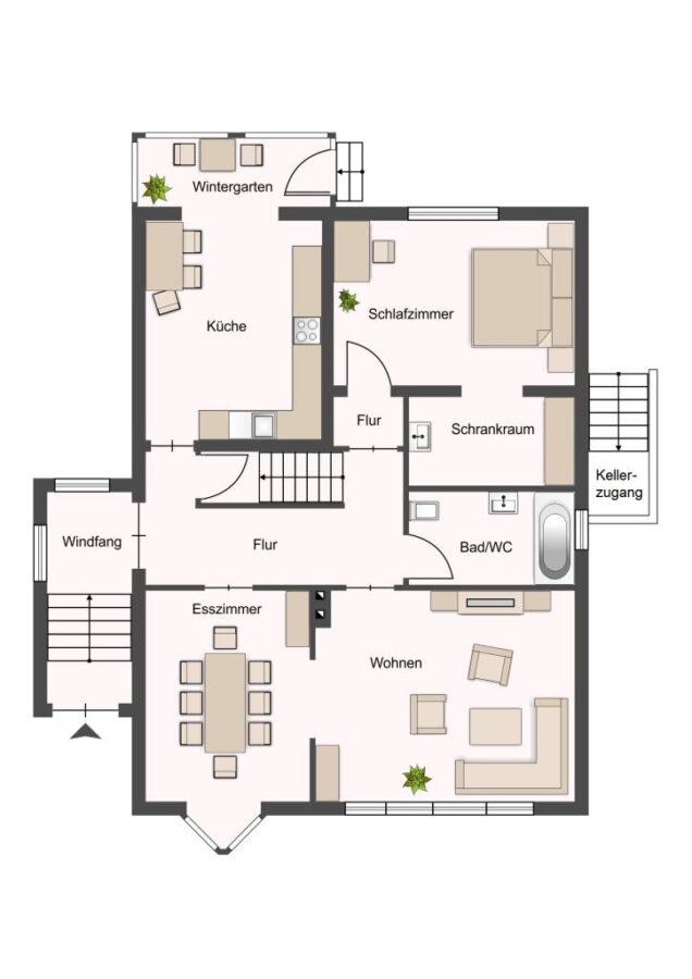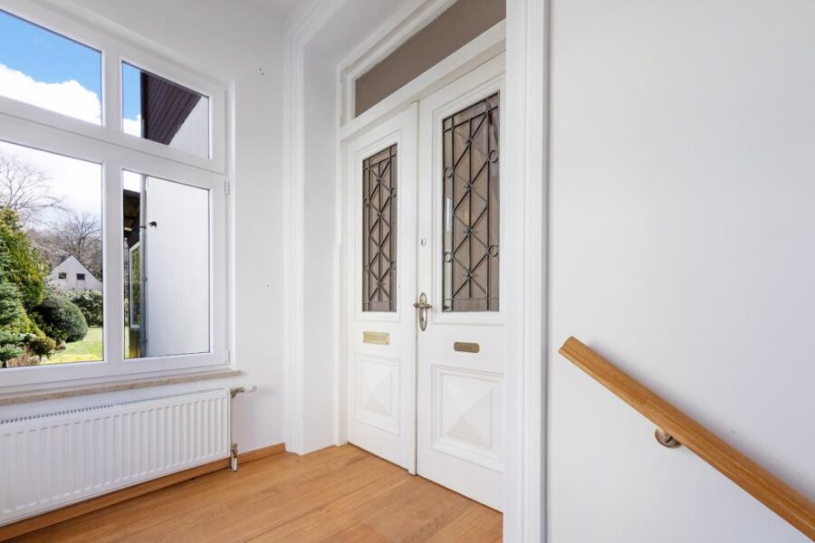 Über eine gepflasterte Zuwegung und einen Treppenaufgang gelangen Sie zum seitlichen Hauseingang mit einem kleinen Windfang. Von hier aus geht es in einen freundlich gestalteten Flurbereich, von welchem alle Zimmer im Erdgeschoss abgehen.