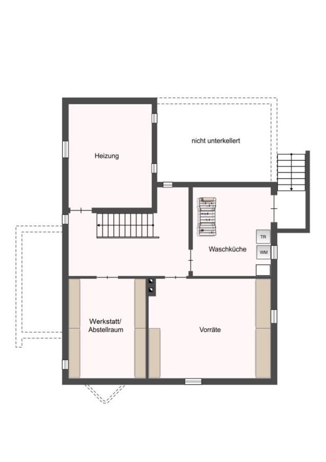 Um schließlich auf den Spitzboden zu gelangen, führt der Weg wieder über die Holztreppe in einen weitläufigen Bodenraum. Der Keller ist zusätzlich über eine Außentreppe erreichbar und hält mit ca. 86 m² zusätzliche Nutzfläche bereit.