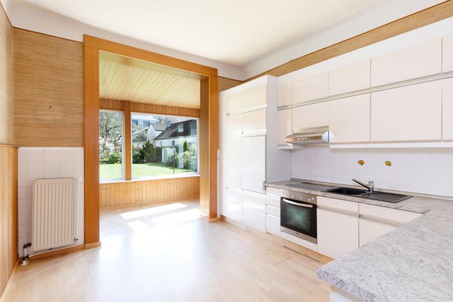 Linker Hand befindet sich die Küche, die mit allen wichtigen E-Geräten ausgestattet ist und Platz für einen großen Esstisch bietet. Direkt an die Küche grenzt ein lichterfüllter Wintergarten, welcher den neuen Bewohnern einen herrlichen Blick in den Garten gewährt.