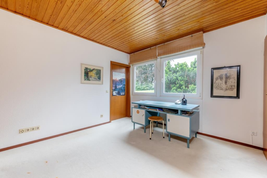 Das praktische Arbeitszimmer, welches mit hellem Teppichboden ausgestattet ist, bietet Platz für einen großen Schreibtisch sowie diverse Regale zur Unterbringung von Ordnern & Co.