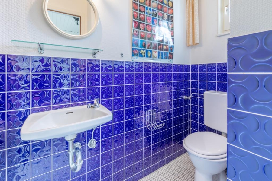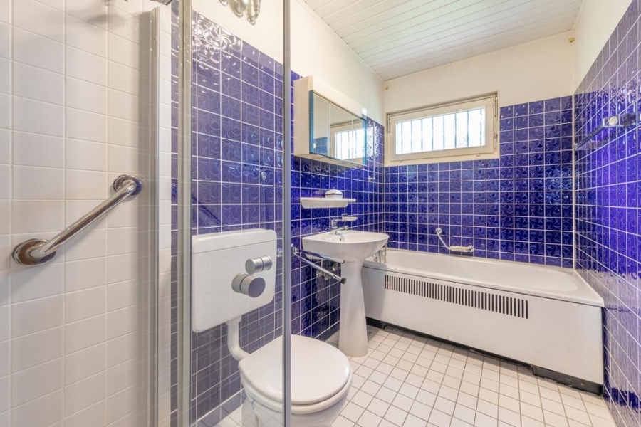 Neben dem Gäste-WC stehen den neuen Eigentümern selbstverständlich auch drei Bäder (zwei im Erdgeschoss, eins im Kellergeschoss) zur Verfügung. Das Vollbad mit separater Dusche ist mit weißen Boden- und blauen Wandfliesen versehen. Darüber hinaus sorgt hier ein Fenster für optimale Belüftung. Zudem befindet sich ein dunkel gefliestes Duschbad im Kellergeschoss.