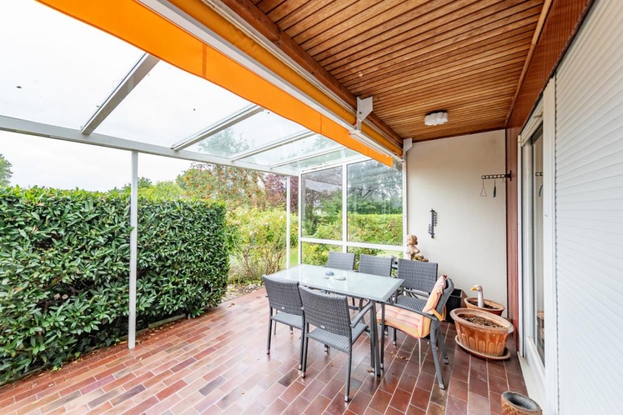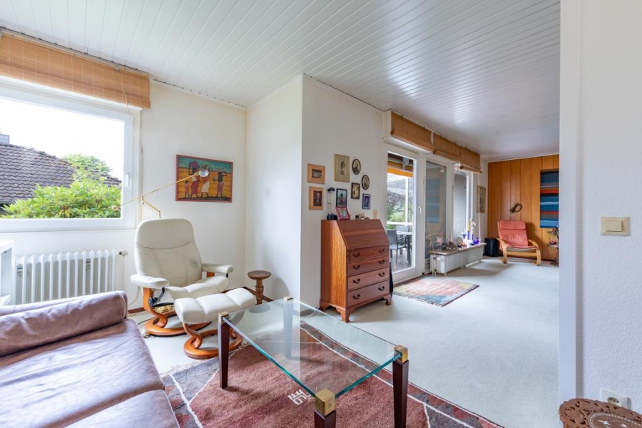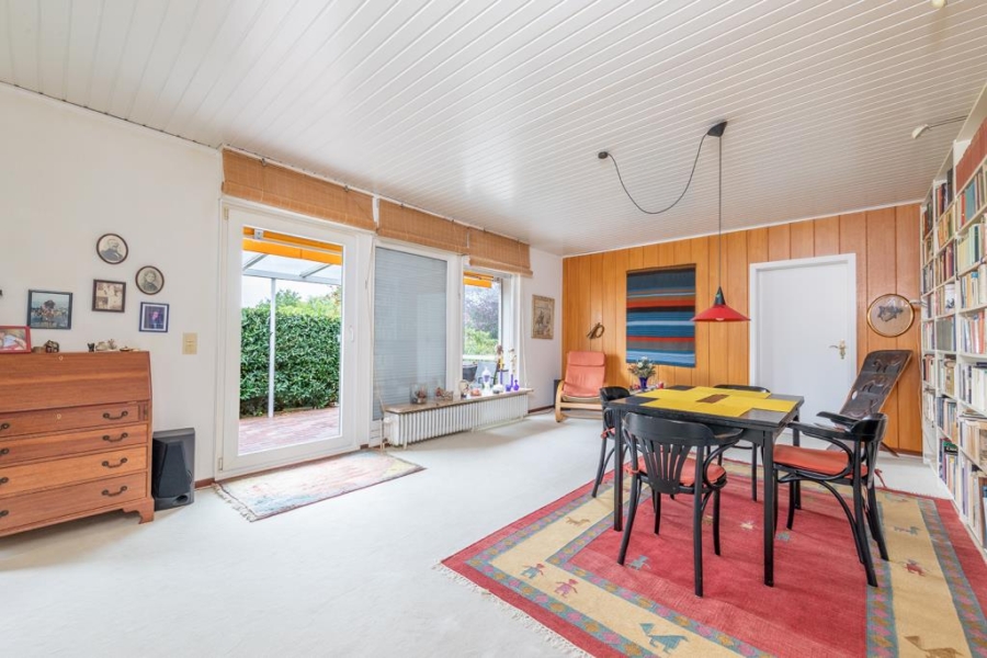Der lichterfüllte Wohn- und Essbereich ist mit einem hellen Teppichboden versehen und bietet genug Platz für eine gemütliche Sofalandschaft. Von hier haben Sie Zugang auf die sonnige, überdachte Terrasse, welche zum Verweilen einlädt.