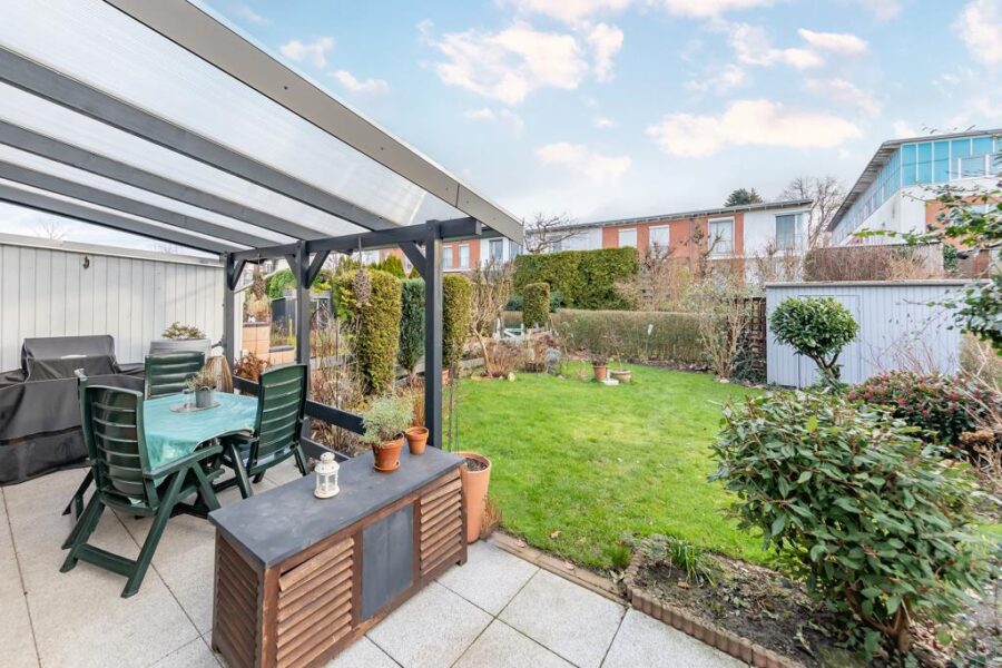 Bei der angebotenen Immobilie handelt es sich um ein Reihenendhaus in beliebter Lage von Boberg. Von außen präsentiert sich die Immobilie mit einer zeitlosen Kombination aus einer hellen Putzfassade und einem klassischen, roten Klinker mit begrüntem Flachdach.