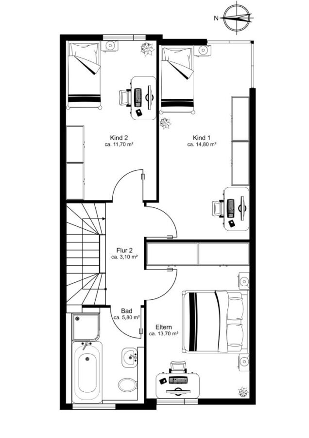 Über eine Holztreppe gelangen Sie in das Obergeschoss, welches mit drei geräumigen Schlafzimmern sowie einem Vollbad inklusive Dusche ausgestattet ist.